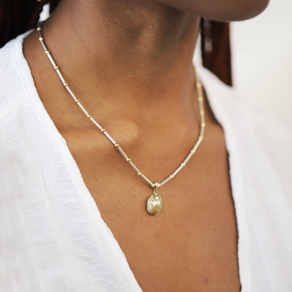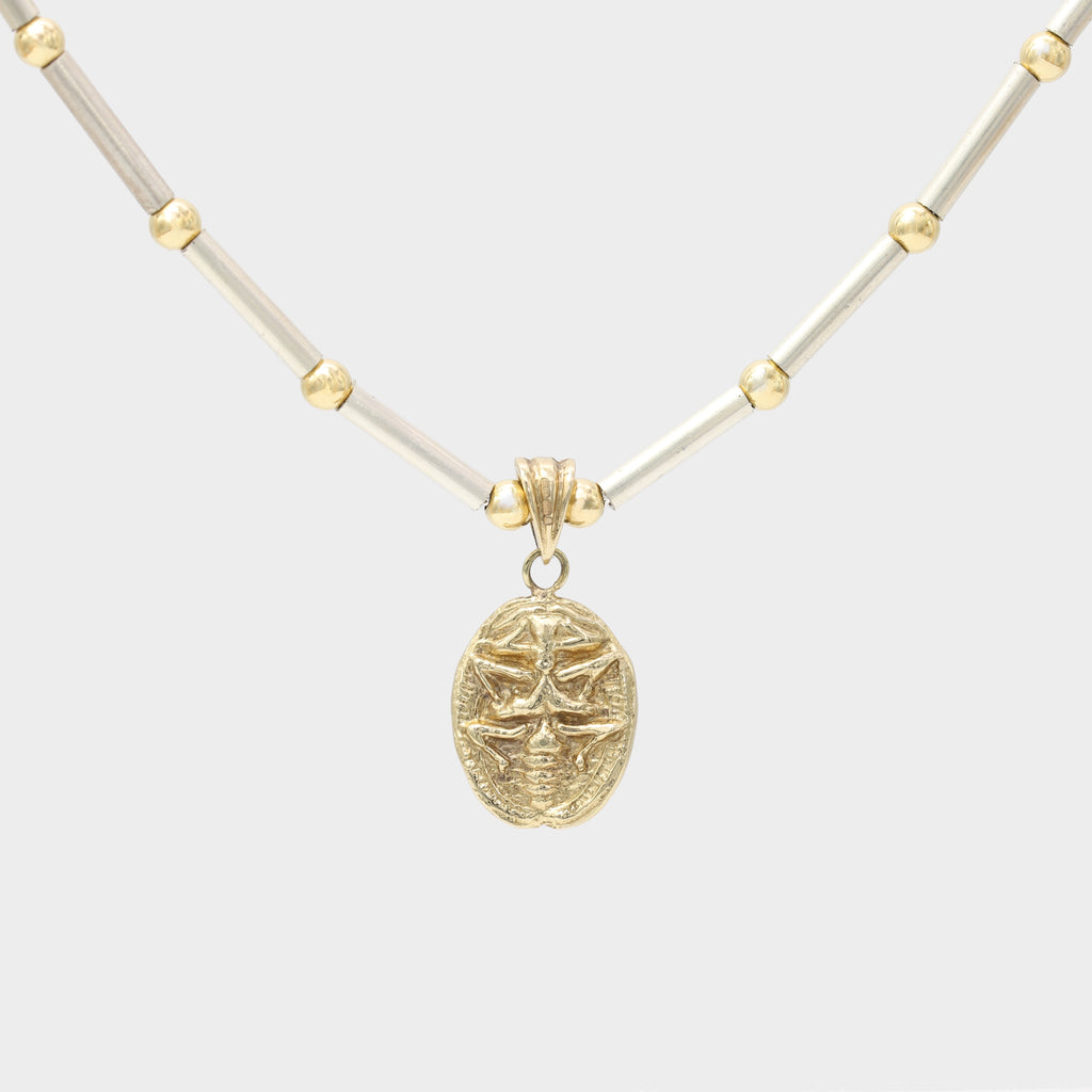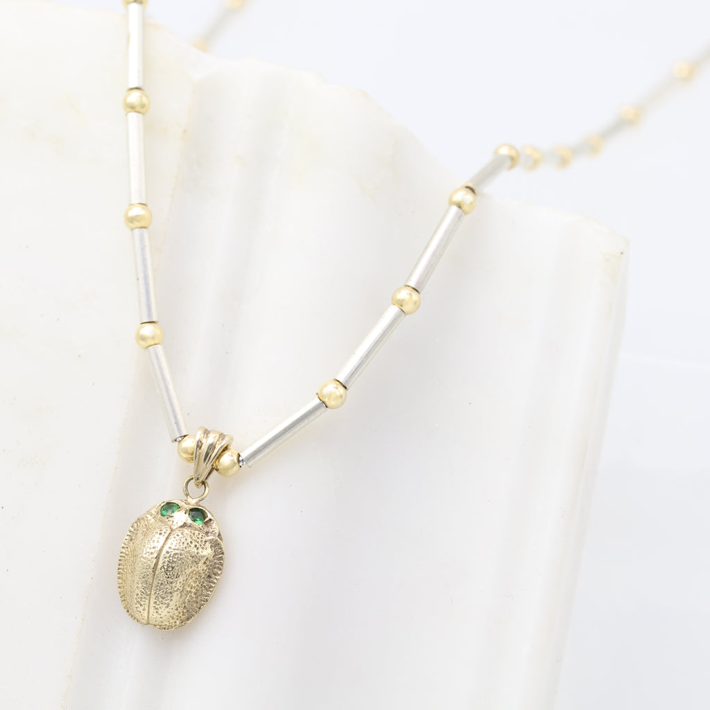 This scarab pendant is featured on our 17 inch signature slim (2mm) beaded chain with alternating sterling silver and 18 carat gold beads.