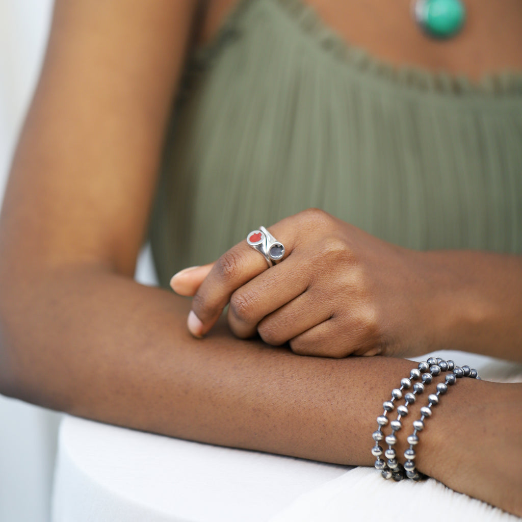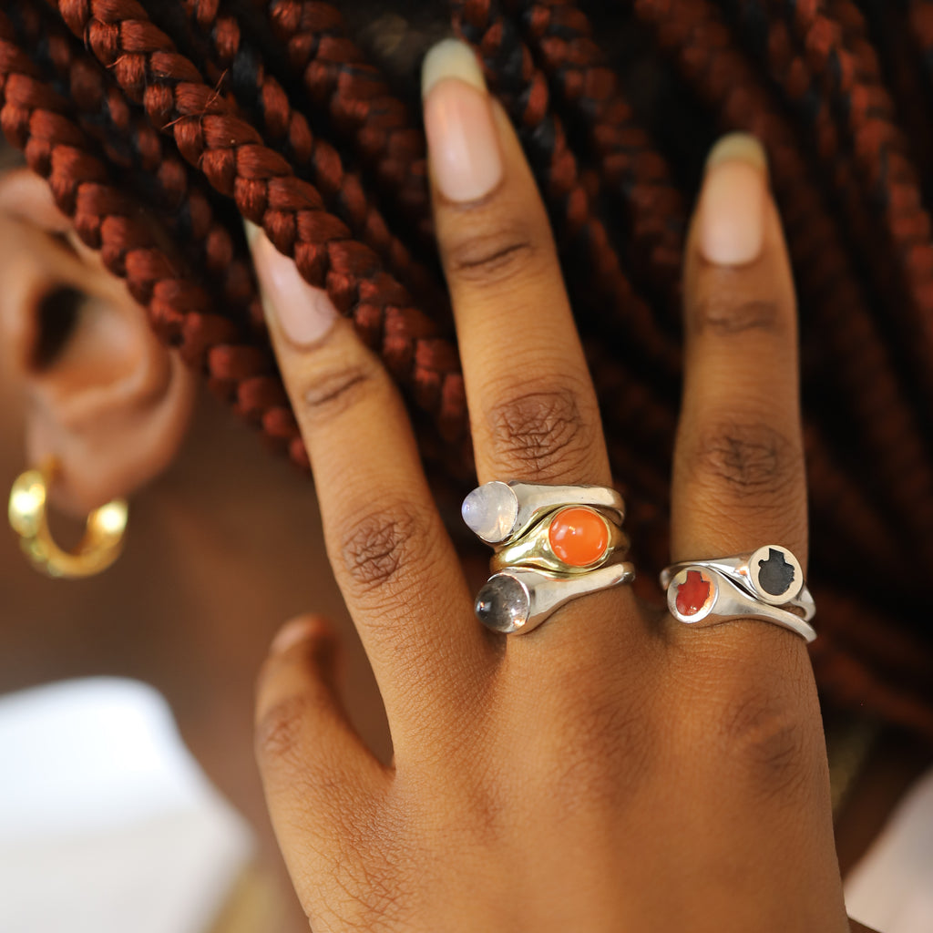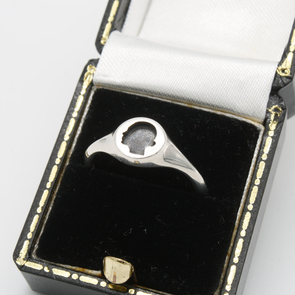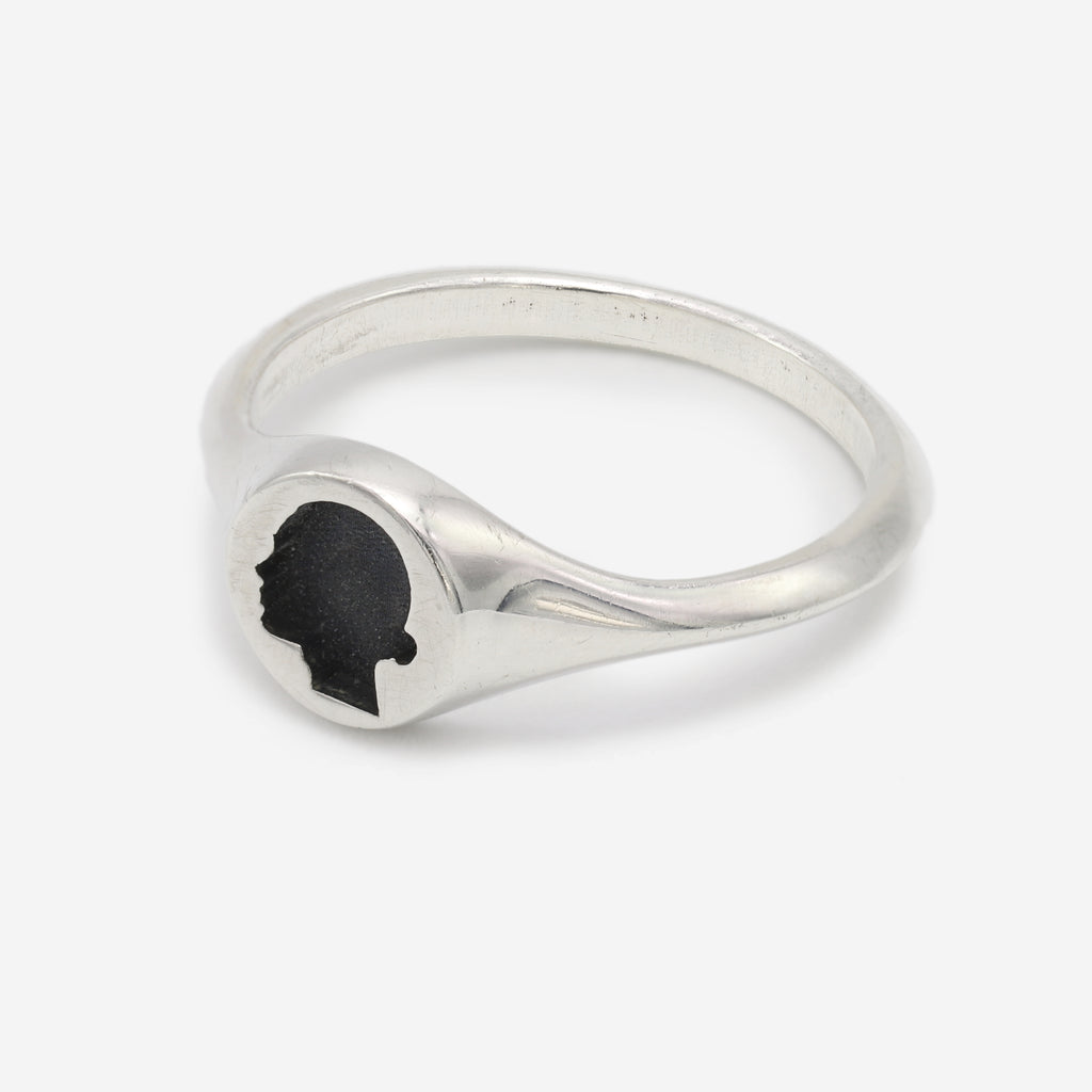 A collection of sterling silver signet rings featuring relief and glass enamel cameo portraits. This ring was one of the earliest designs for the brand. The signature silhouette is modeled on our founder Edie Charles using the aid of computer design software and 3D printing technology to produce a perfect profile in miniature. The design was inspired by Edie’s love of antique cameos and memento-mori silhouette portraits. These classic motifs combined with cutting edge technology to produce an heirloom design with futuristic precision. This sterling silver signet ring features an oxidized negative cameo silhouette.