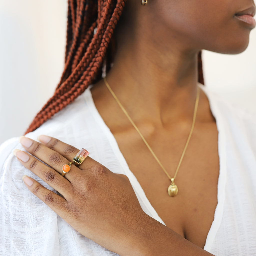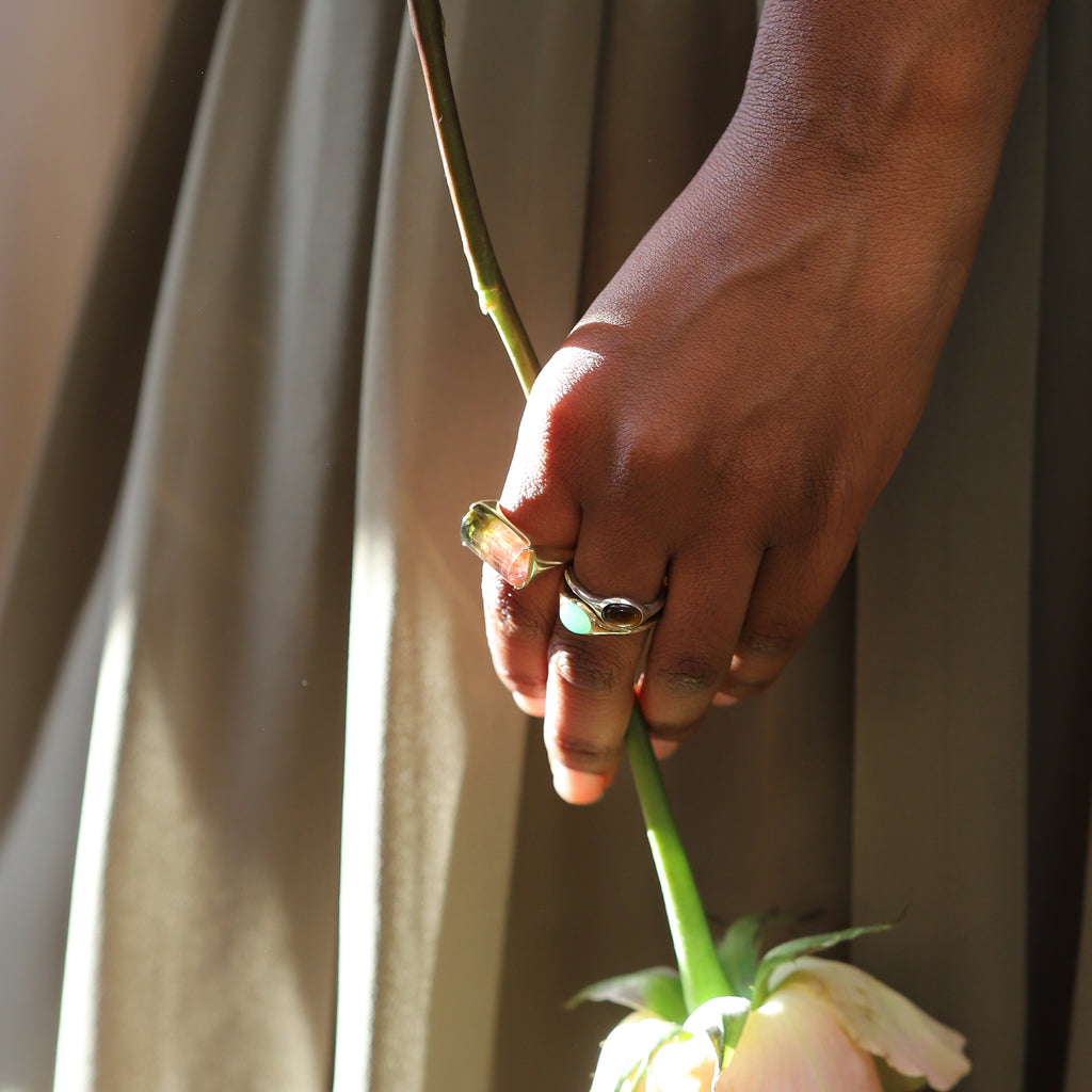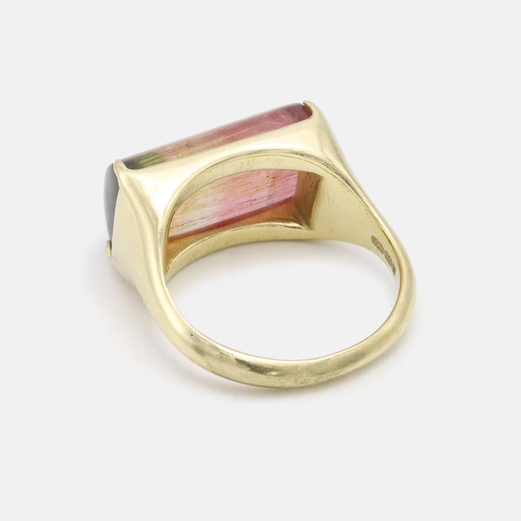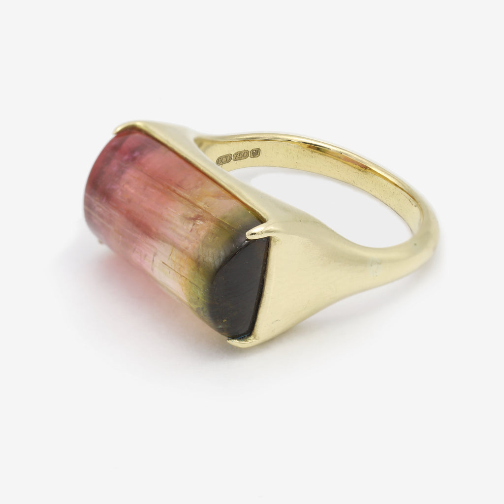 This exceptional ring is formed in 18 carat yellow gold with an open-back setting, featuring an exquisite watermelon tourmaline. Named after Iris, the ancient Greek goddess of the rainbow, this truly unique tourmaline features a spectral array of colours from pinks to yellows and greens.