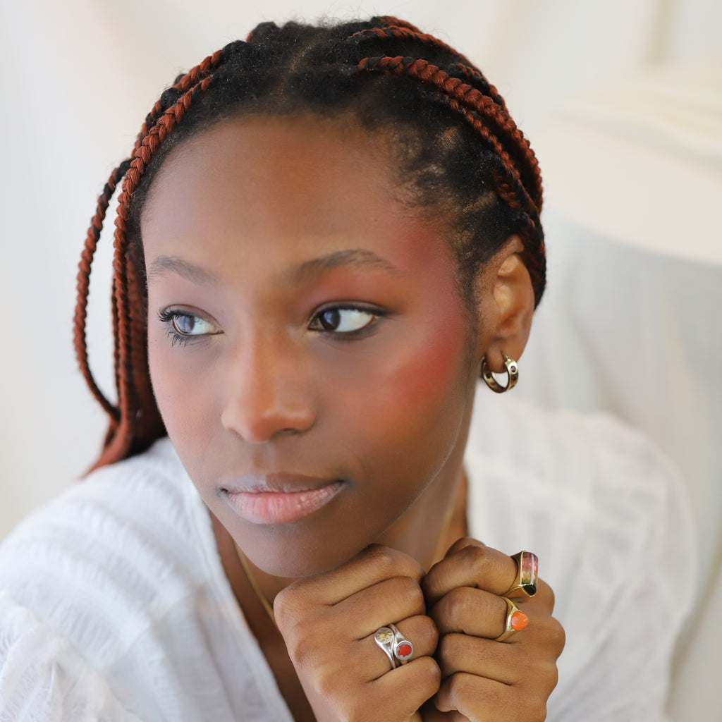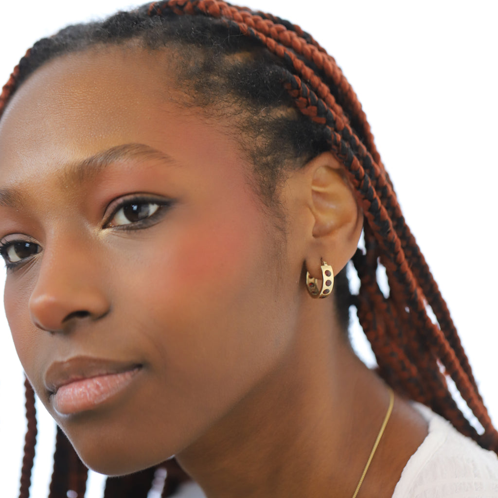 Helios embodied the sun in ancient Greek and Roman mythology. He was the great and glowing sun itself and the bringer of light and warmth. An ancient guardian of oaths and the god of sight, he shone upon the earth each day from a golden horse-drawn chariot that he rode across the sky. Helios was usually depicted full of youth and wearing a glowing crown that shone with the light of the sun. Inspired by these depictions the Helios Hoops are in the form of circlets that frame the ear with a sparkling halo. These chunky yet elegant everyday hoops are made from 9 carat yellow gold and set with sixteen deeply rich burgundy garnet gemstones.