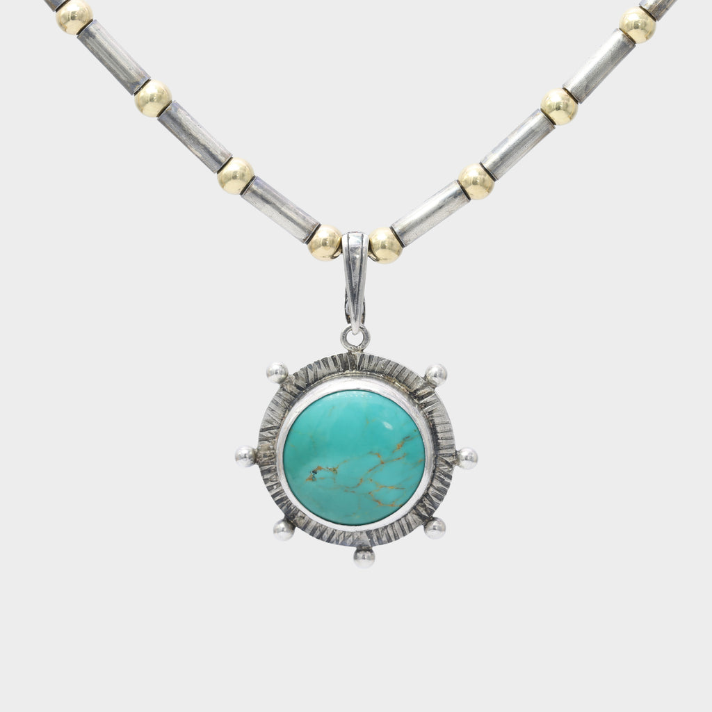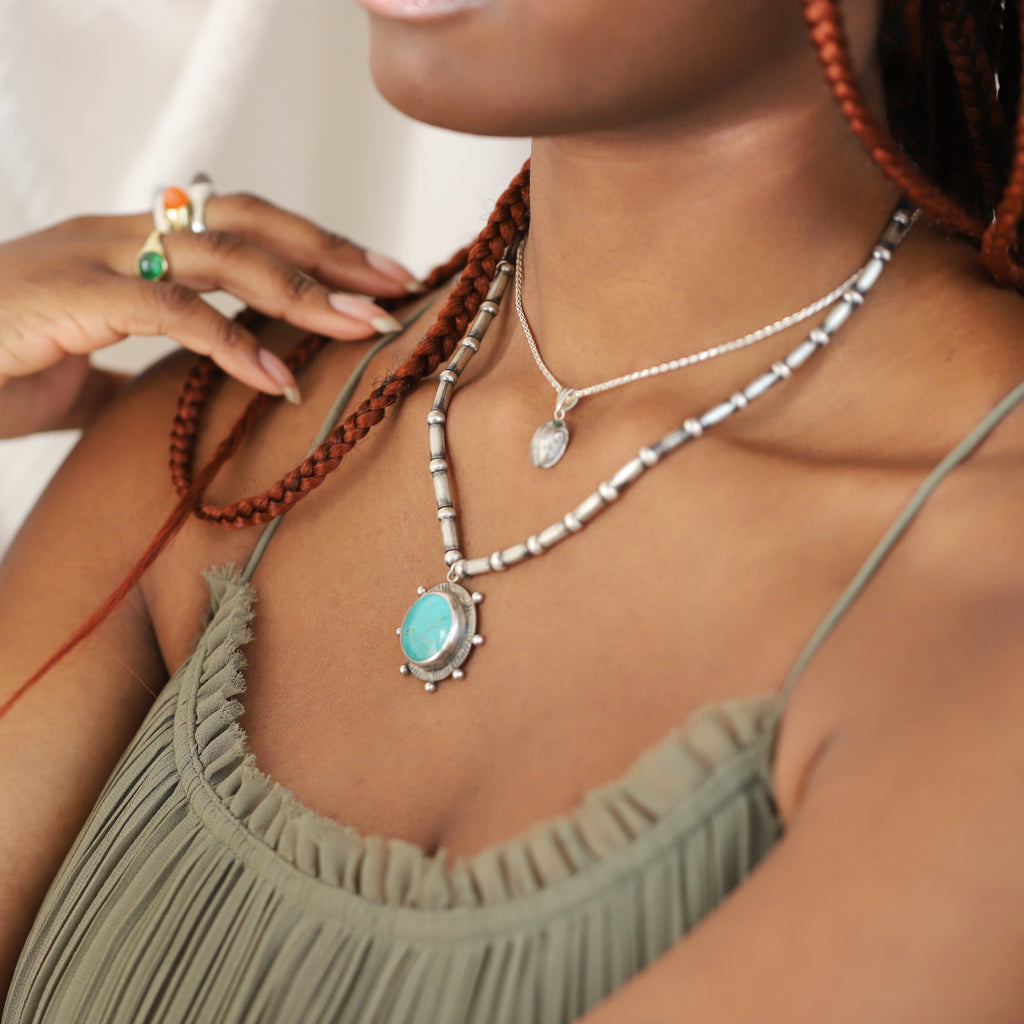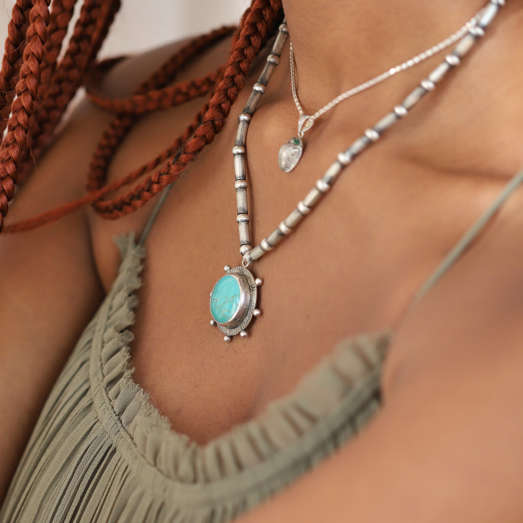 Turquoise is said to enhance communication and self-expression, making it a powerful gemstone for those seeking to improve their communication skills or to express their true selves. Known for its association with protection, healing, and spiritual attunement, it is believed to help balance the energies of the body, mind, and spirit, and to promote feelings of inner peace and harmony. The bright blue and green hues of the turquoise are set in a hand textured and adorned sterling silver frame, sold as either a pendant with attached clasp, or built into one of our signature beaded necklaces.