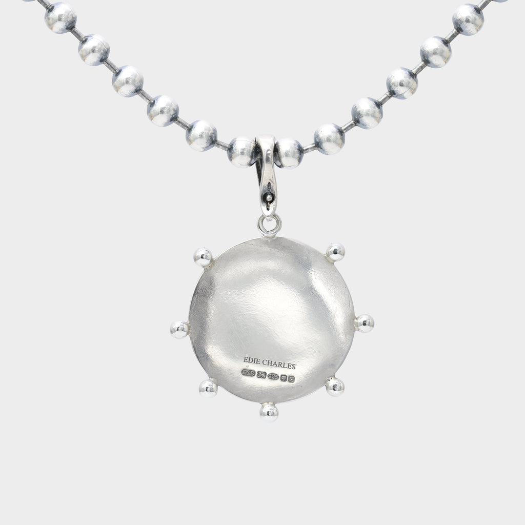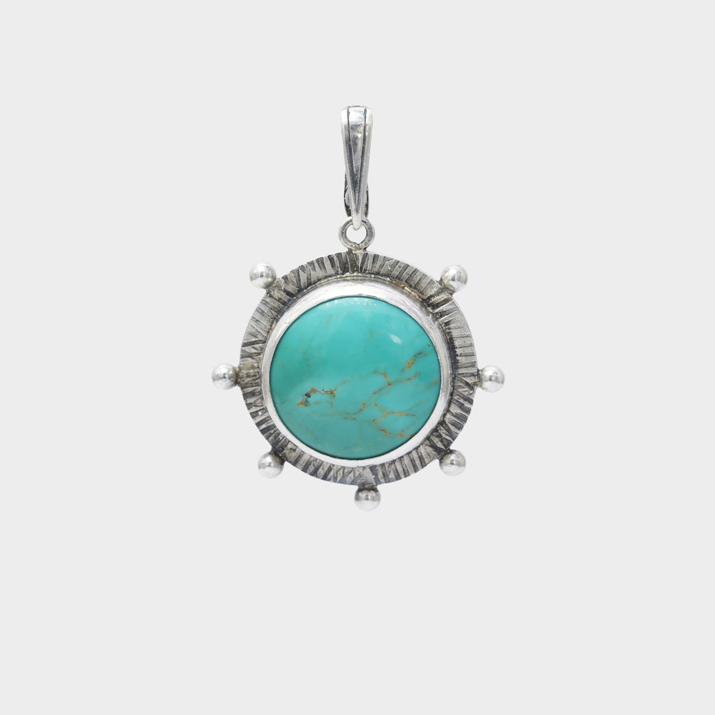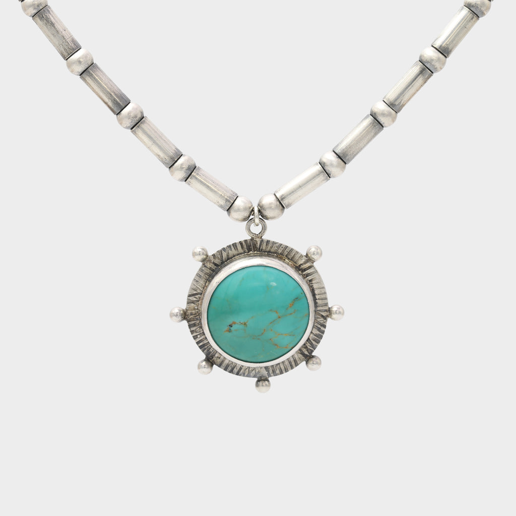 Turquoise is said to enhance communication and self-expression, making it a powerful gemstone for those seeking to improve their communication skills or to express their true selves. Known for its association with protection, healing, and spiritual attunement, it is believed to help balance the energies of the body, mind, and spirit, and to promote feelings of inner peace and harmony. The bright blue and green hues of the turquoise are set in a hand textured and adorned sterling silver frame, sold as either a pendant with attached clasp, or built into one of our signature beaded necklaces.