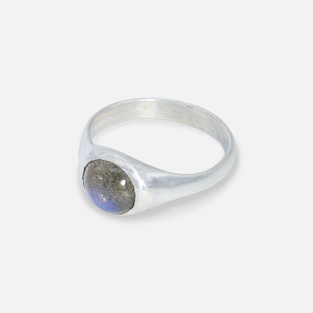 Named after Circe, a sorceress who could transform humans into beasts, this unique ring is formed in sterling silver with a hand-textured band. It features an apex labradorite cabochon that has captivating inclusions evoking divinations. In certain light, the stone’s color transmutes from clear to a stunning play of iridescent blue.