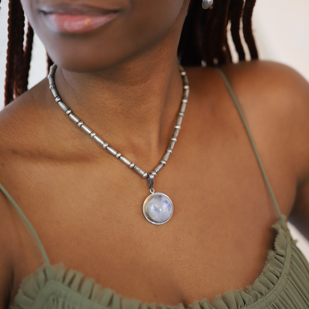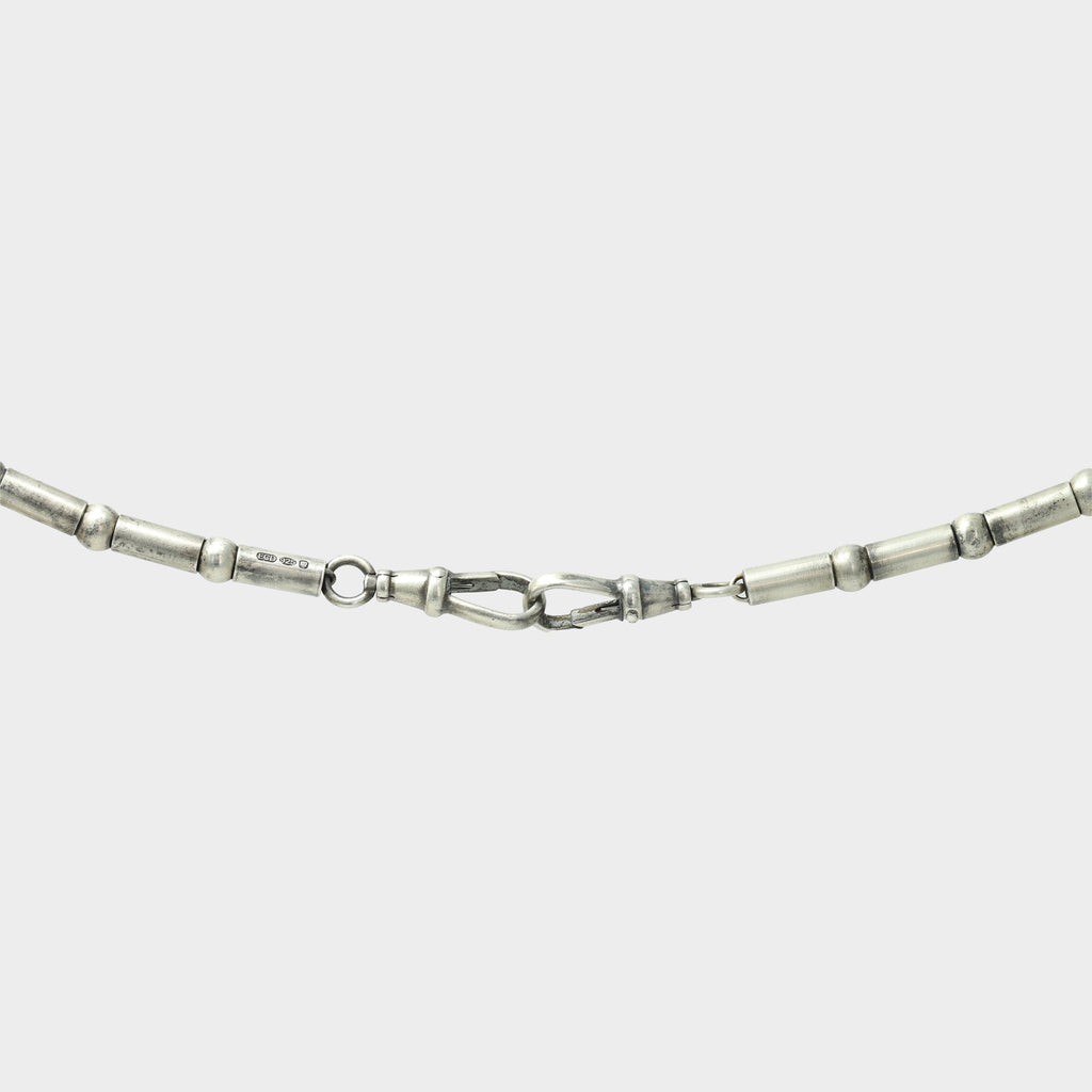 The Signature beaded necklaces by Edie Charles are hand made in our studio. With alternating oxidised chunky sterling silver tube and ball beads on a 15 inch chain (5mm), this necklace is the perfect signature piece for our unique pendants.