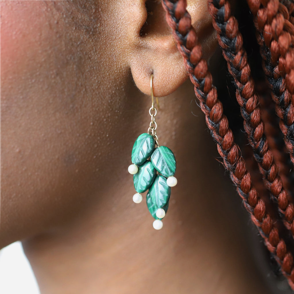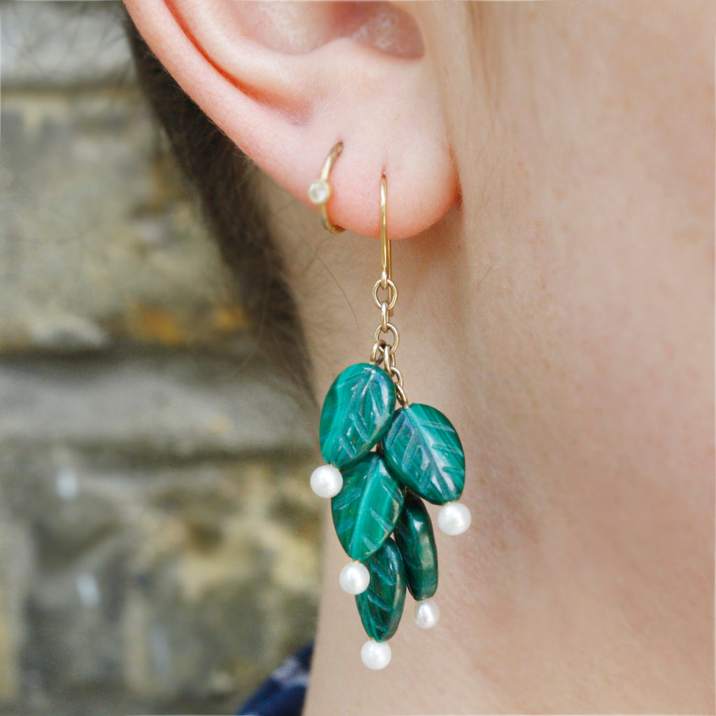 These elegant and effortless statement earrings are made of 9 carat yellow gold and feature beaded drops of verdant malachite accented with pearls. The tranquil beauty of malachite and the delicacy of hanging foliage inspired this botanical chandelier design. The gentle movement of the stone leaves creates a beautiful auditory experience for the wearer.