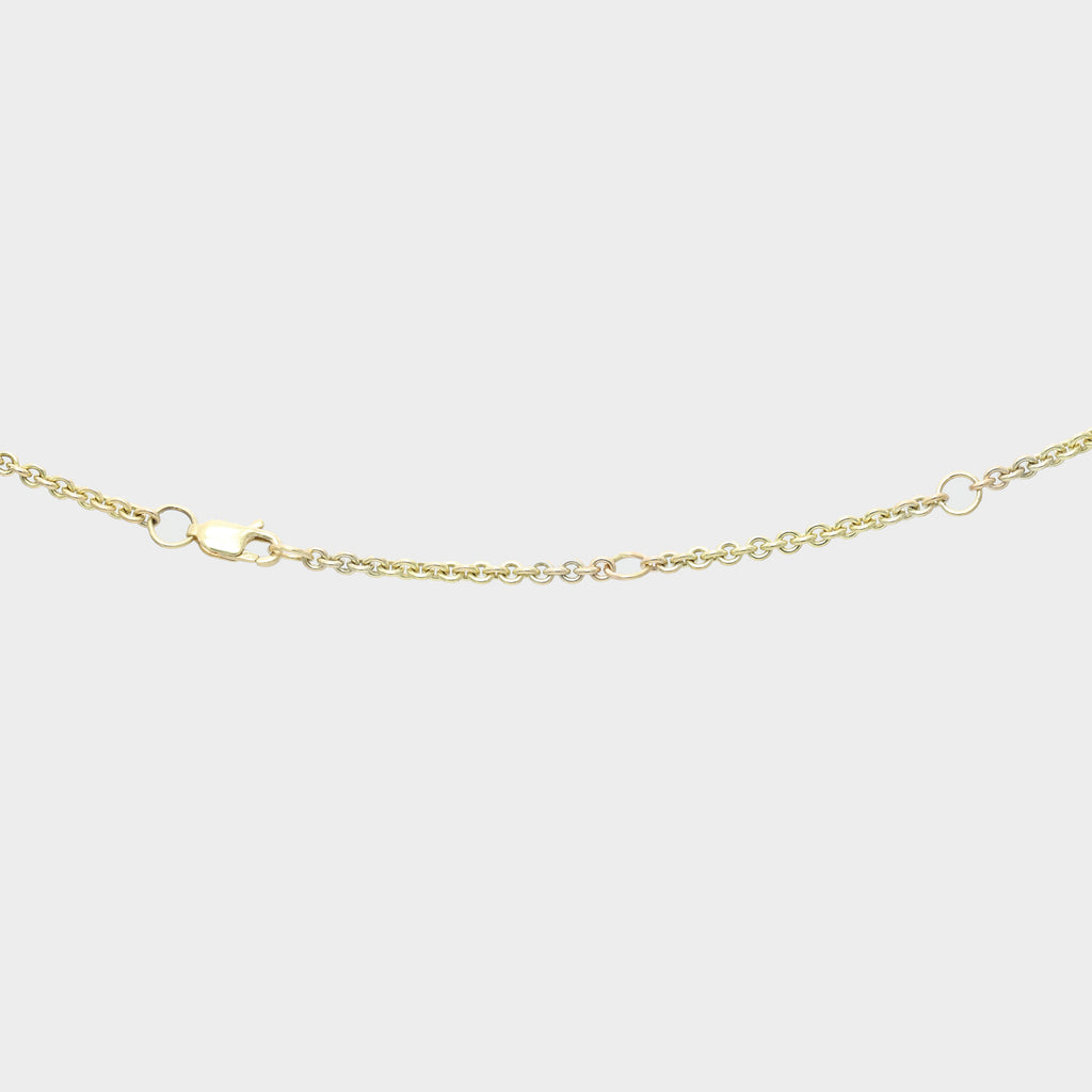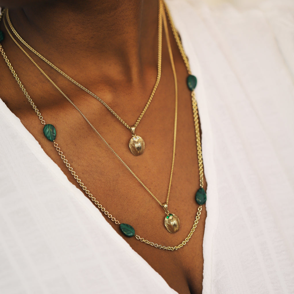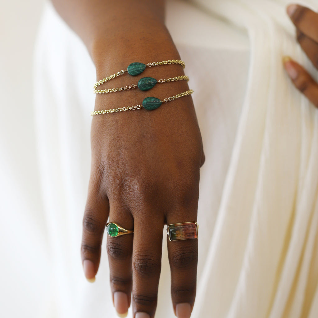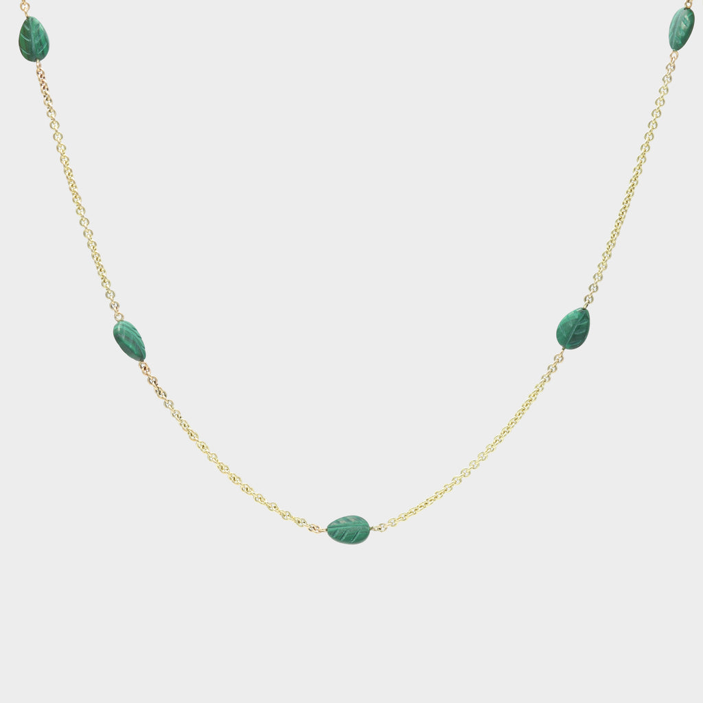 This delicate 9 carat gold chain features beautiful malachite leaves that are suspended along its length. The size is adjustable so it can be customised to fit your look. A perfect pairing with the malachite earrings in our