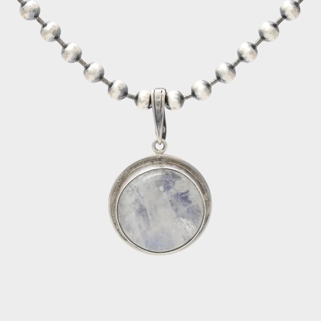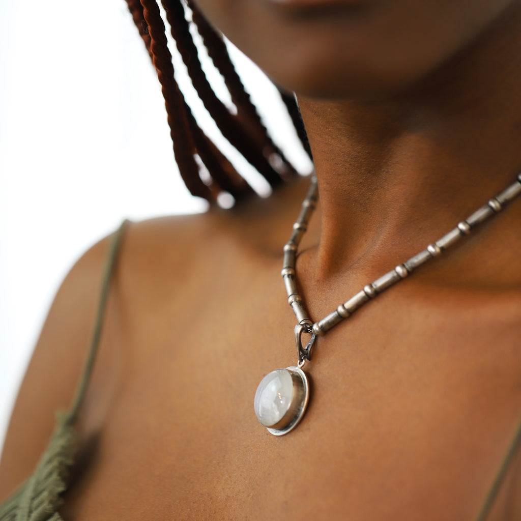 Moonstones are known for their associations with intuition, feminine energy, and spiritual growth. They are believed to help enhance psychic abilities and intuition, and to promote feelings of inner peace and emotional balance. The shimmering, iridescent quality of the stone evokes the soft glow of the moon and they are known to inspire feelings of mystery, magic, and enchantment. Set in sterling silver, this moonstone amulet is available as either a standalone pendant, or attached to any of our signature beaded necklaces.