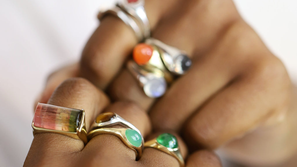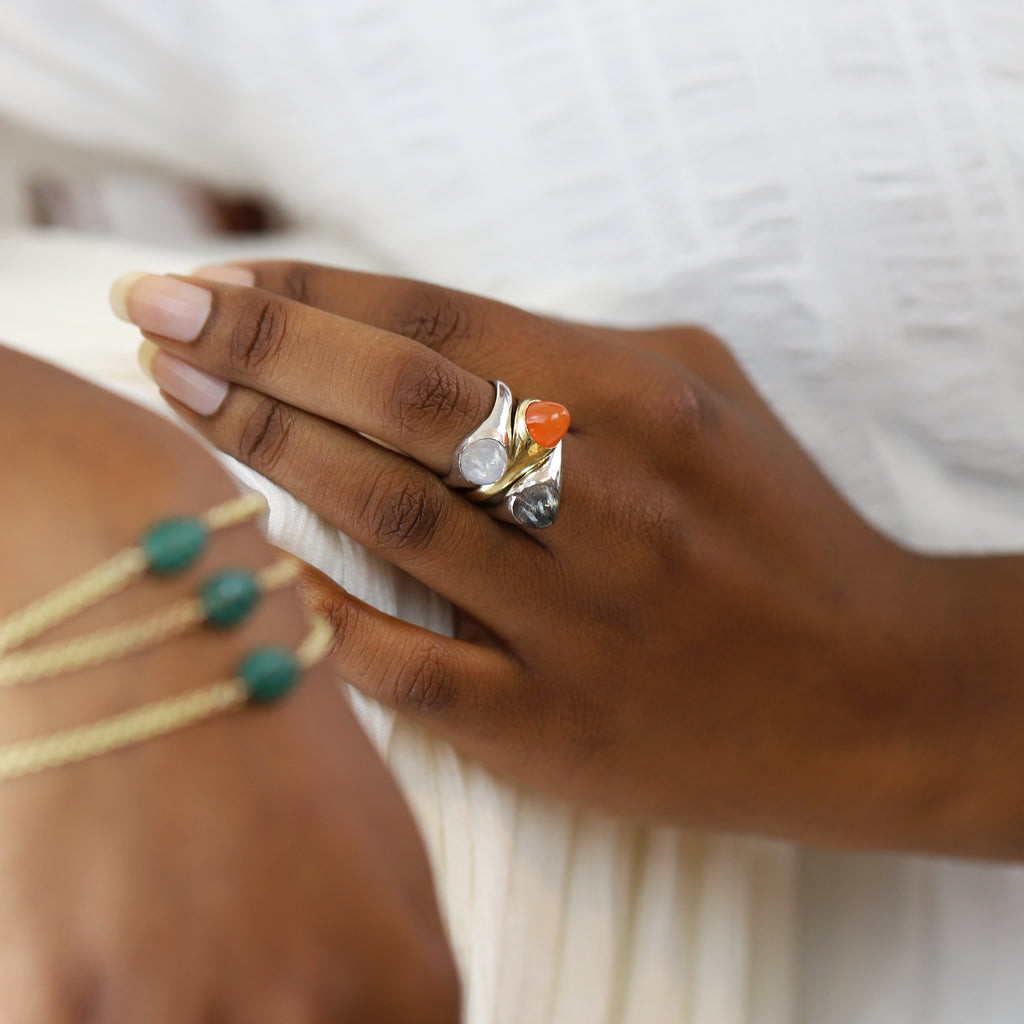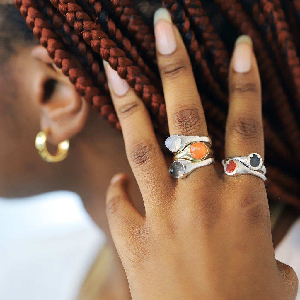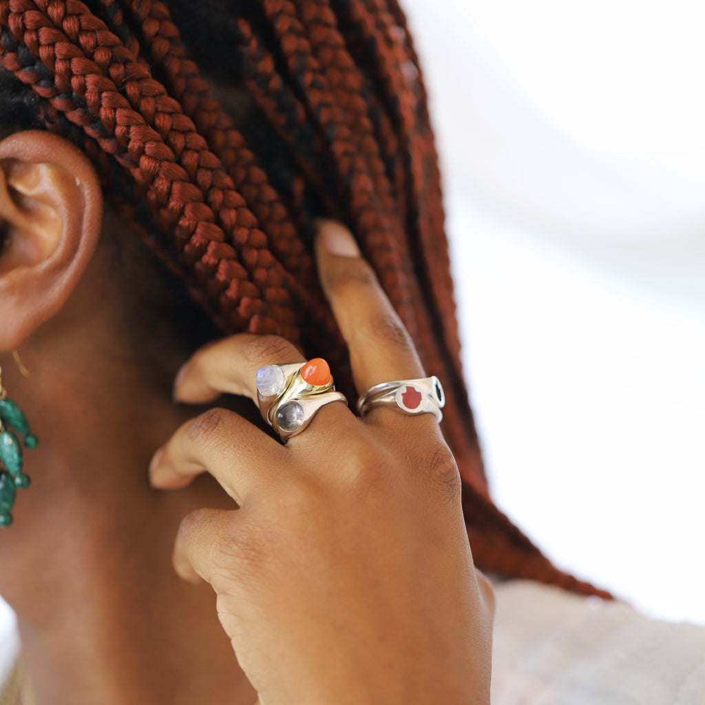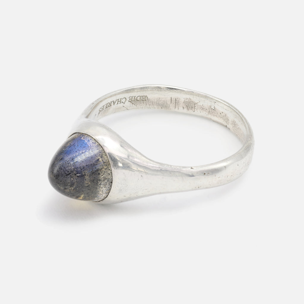 Named after Circe, a sorceress who could transform humans into beasts, this unique ring is formed in sterling silver with a hand-textured band. It features an apex labradorite cabochon that has captivating inclusions evoking divinations. In certain light, the stone’s color transmutes from clear to a stunning play of iridescent blue.