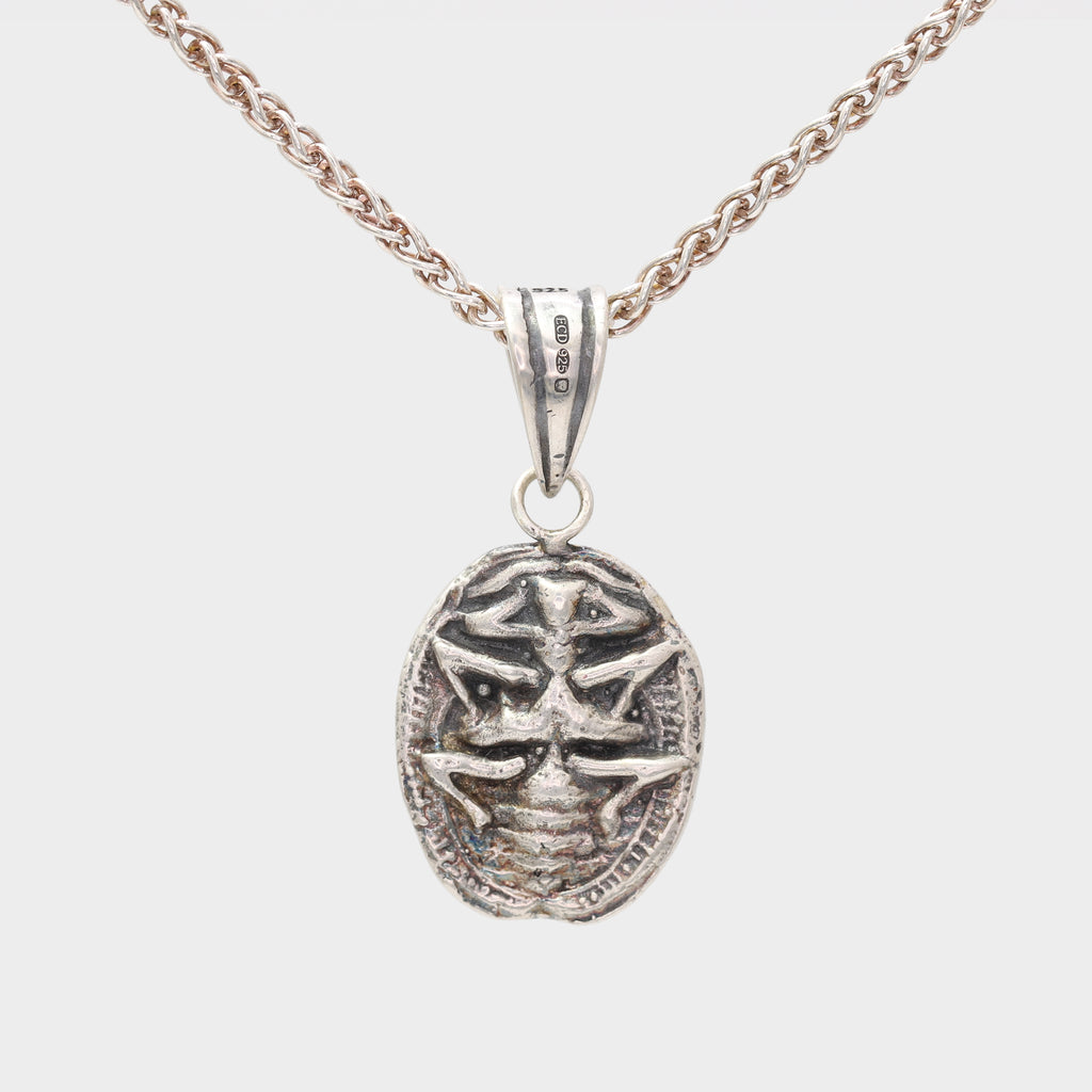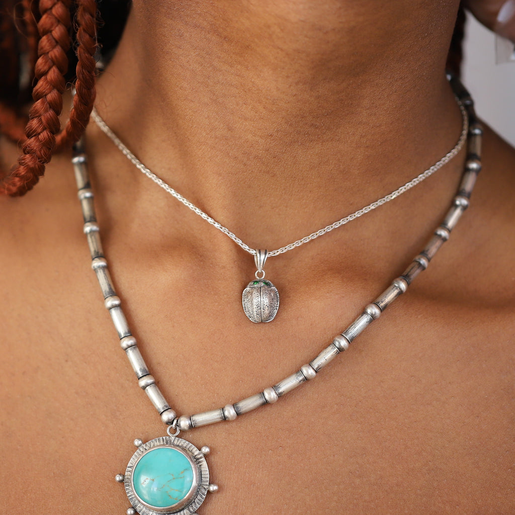 This scarab pendant comes in four options of chain: an 18 inch sterling silver diamond cut wheat chain (1.5mm), a 22 or 18 inch sterling silver wheat chain (1.5mm), or an 18 inch sterling silver rounded box chain (1mm).
