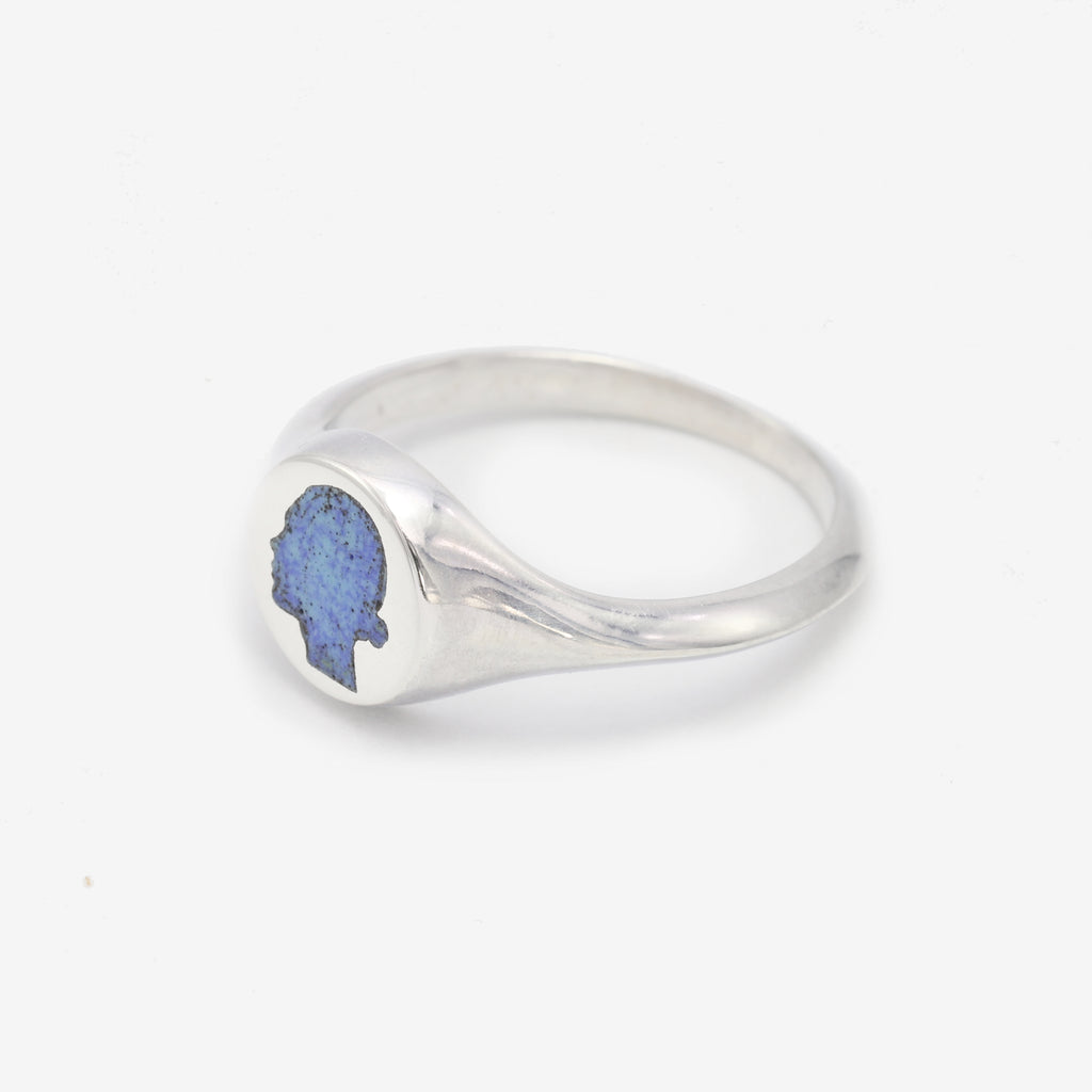 A collection of sterling silver signet rings featuring relief and glass enamel cameo portraits. This ring was one of the earliest designs for the brand. The signature silhouette is modeled on our founder Edie Charles using the aid of computer design software and 3D printing technology to produce a perfect profile in miniature. The design was inspired by Edie’s love of antique cameos and memento-mori silhouette portraits. These classic motifs combined with cutting edge technology to produce an heirloom design with futuristic precision. This sterling silver signet ring features a speckled blue enamel silhouette cameo.